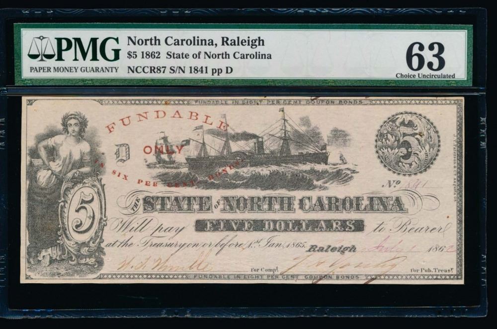 One 1862 $5 Raleigh NC Obsolete Note PMG 63.