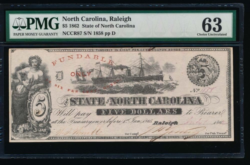 One 1862 $5 Raleigh NC Obsolete Note PMG 63.