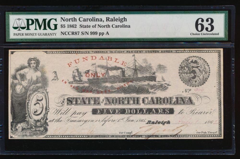 One 1862 $5 Raleigh NC Obsolete Note PMG 63.