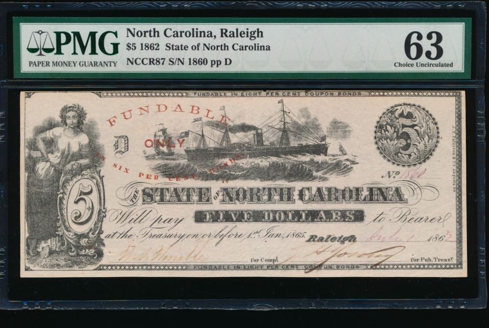 One 1862 $5 Raleigh NC Obsolete Note PMG 63.