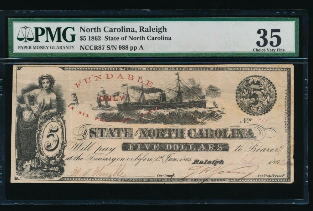 One 1862 $5 Raleigh NC Obsolete PMG 35.