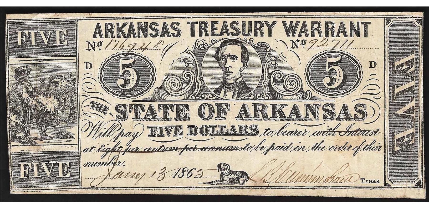 One 1862 $5 State of Arkansas Treasury Warrant Note.
