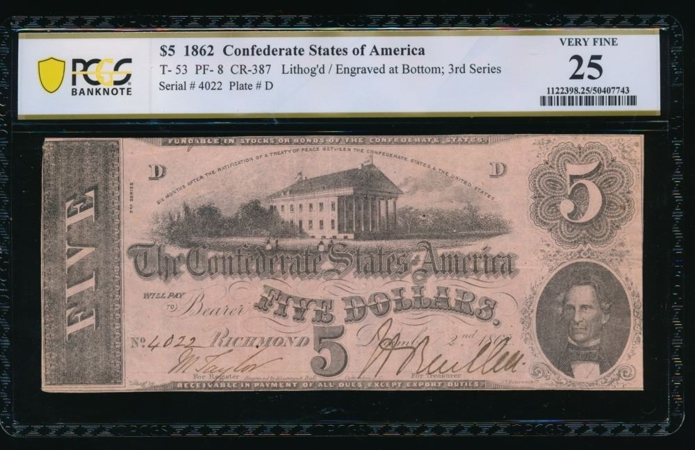One 1862 $5 T-53 Confederate PCGS 25.