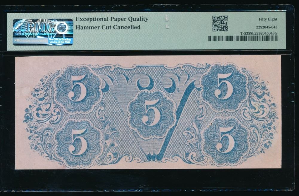 One 1862 $5 T-53 Confederate PMG 58EPQ.