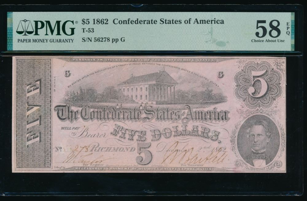 One 1862 $5 T-53 Confederate PMG 58EPQ.