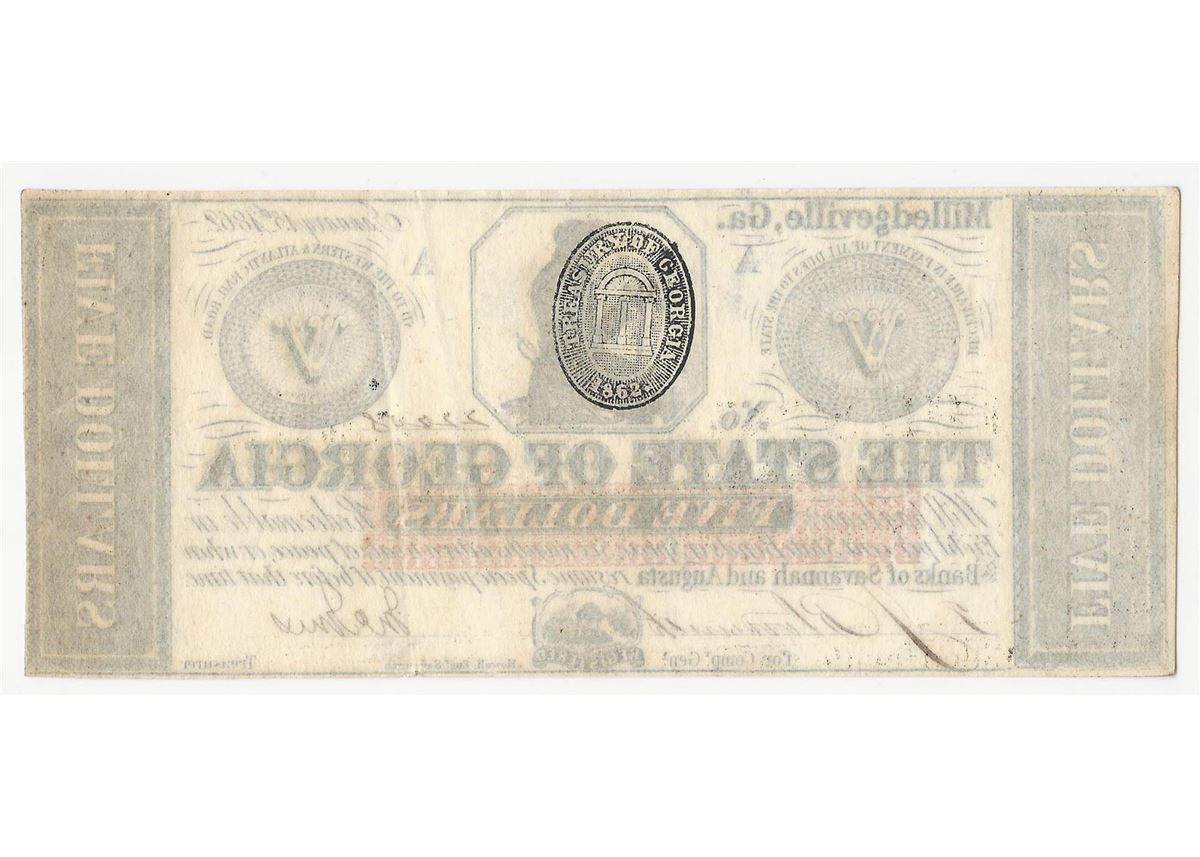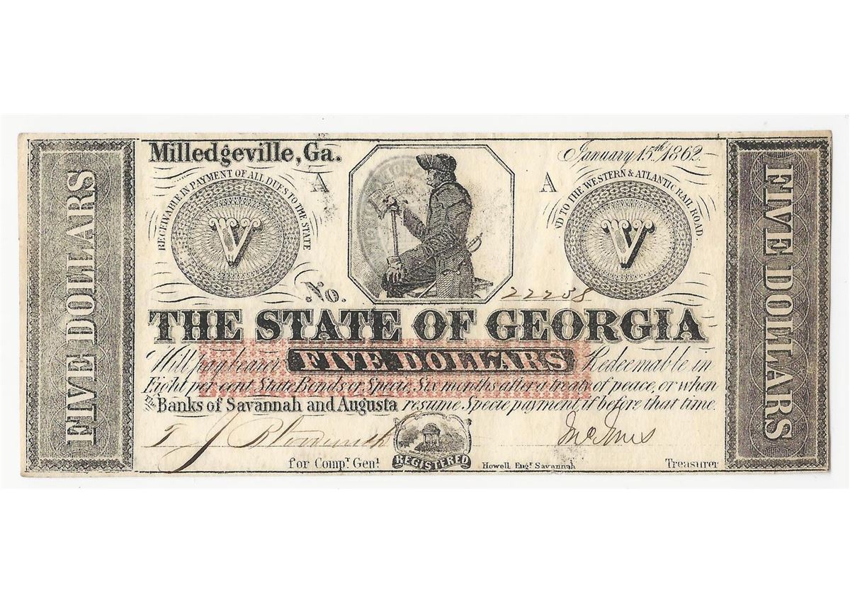 One 1862 $5 The State of Georgia Confederate Note.