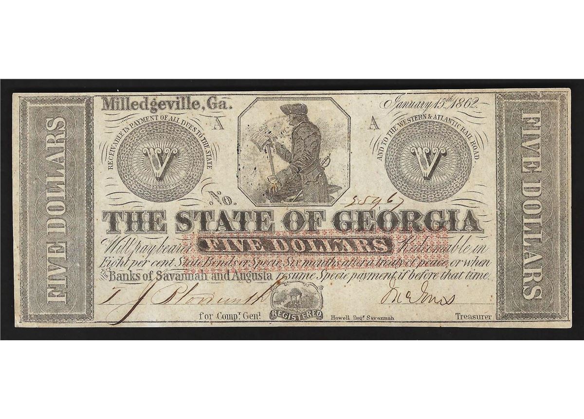 One 1862 $5 The State of Georgia Obsolete Bank Note.