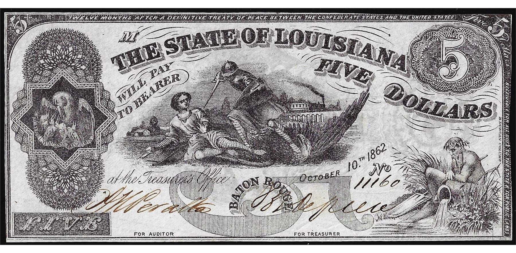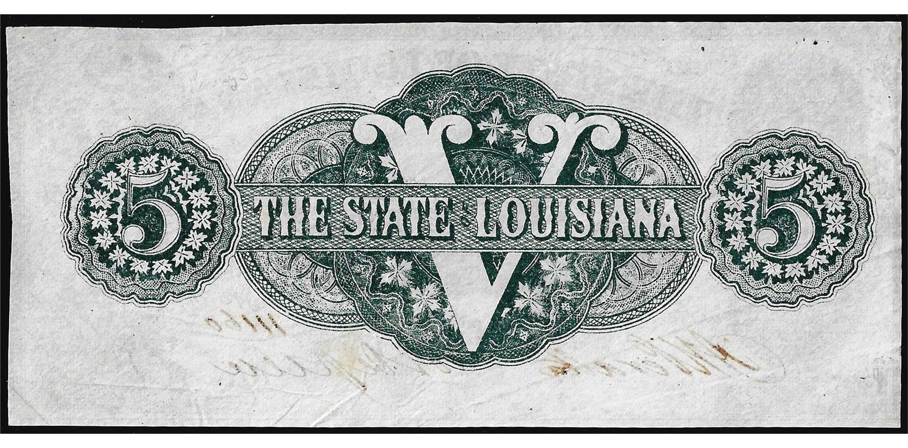 One 1862 $5 The State of Louisiana Baton Rouge Obsolete Note.