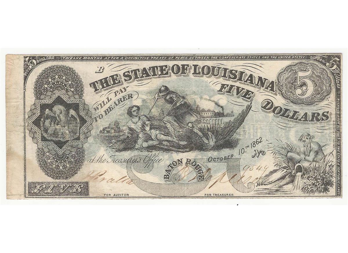One 1862 $5 The State of Louisiana Obsolete Bank Note.