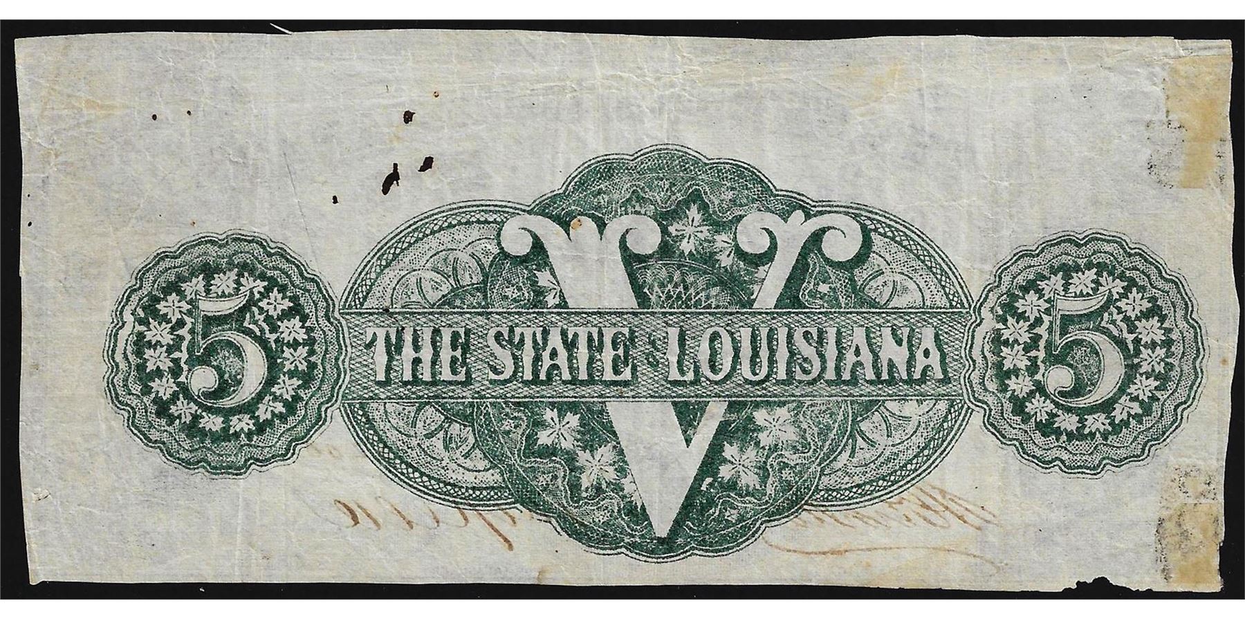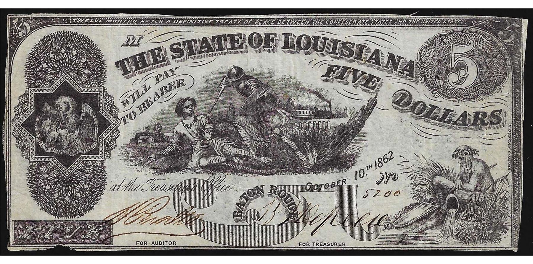 One 1862 $5 The State of Louisiana Obsolete Bank Note.