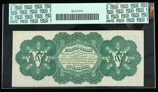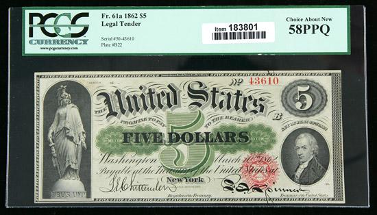 1862, $5 United States Note. PCGS Choice About New 58PPQ. . Fr-61a. A single light corner bend is the only grade-limiting factor on this beautiful, fully original example.