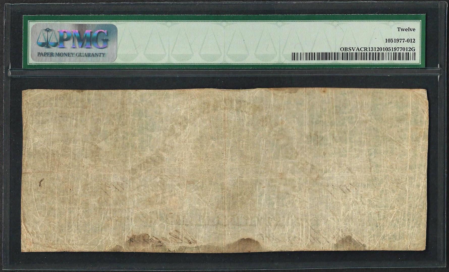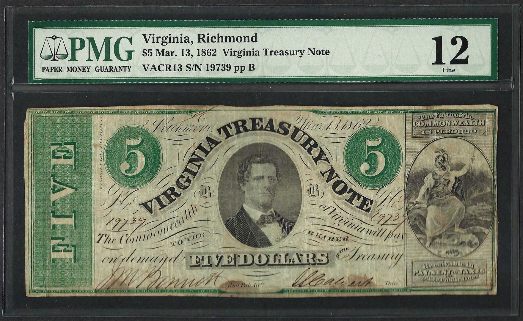One 1862 $5 Virginia Treasury Note Obsolete Note PMG Fine 12. PMG Certified.