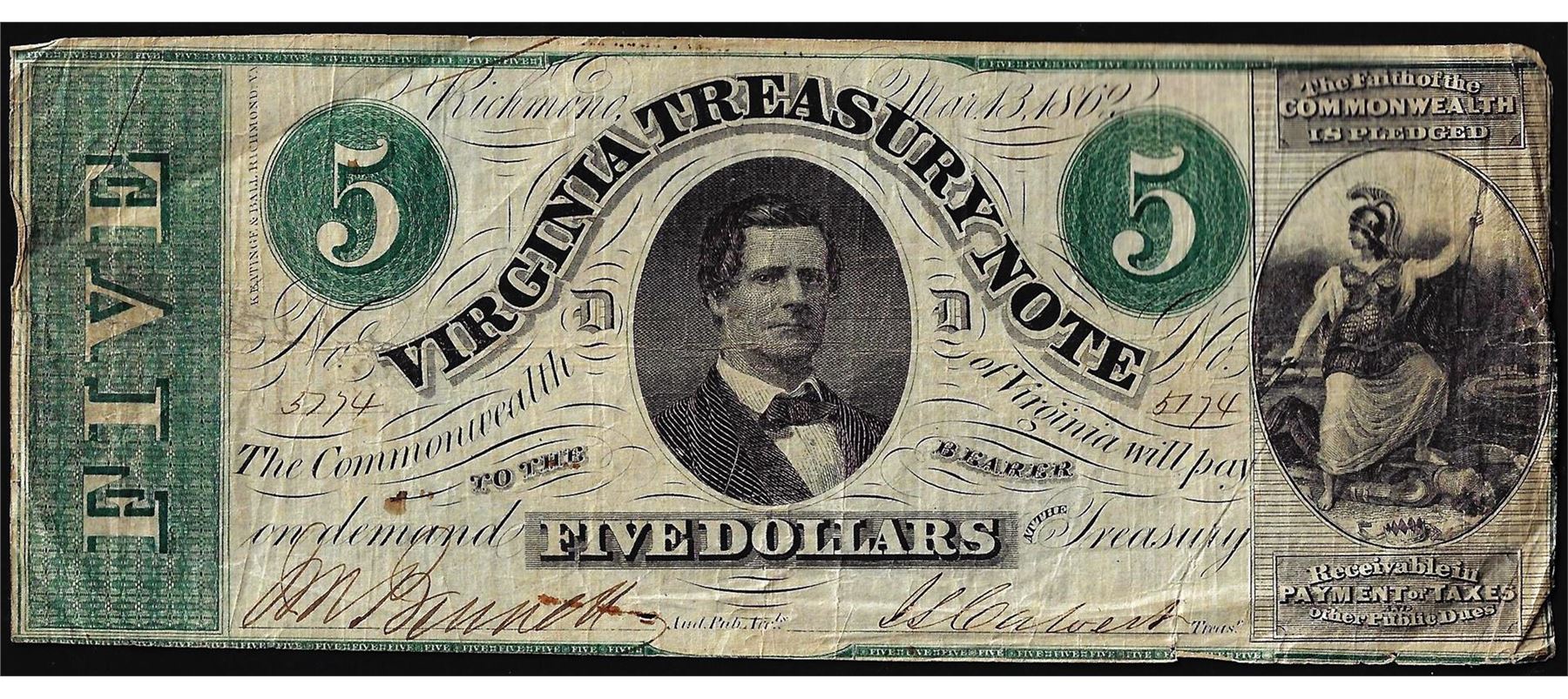 One 1862 $5 Virginia Treasury Note Obsolete Note.