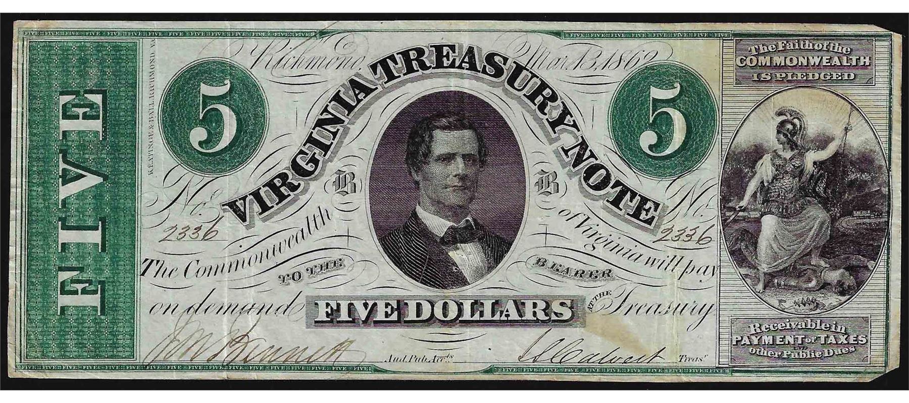 One 1862 $5 Virginia Treasury Obsolete Bank Note.