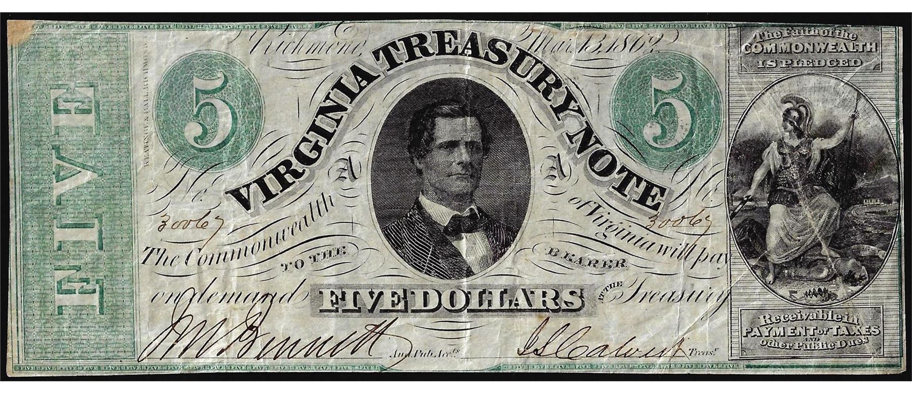 One 1862 $5 Virginia Treasury Obsolete Note.