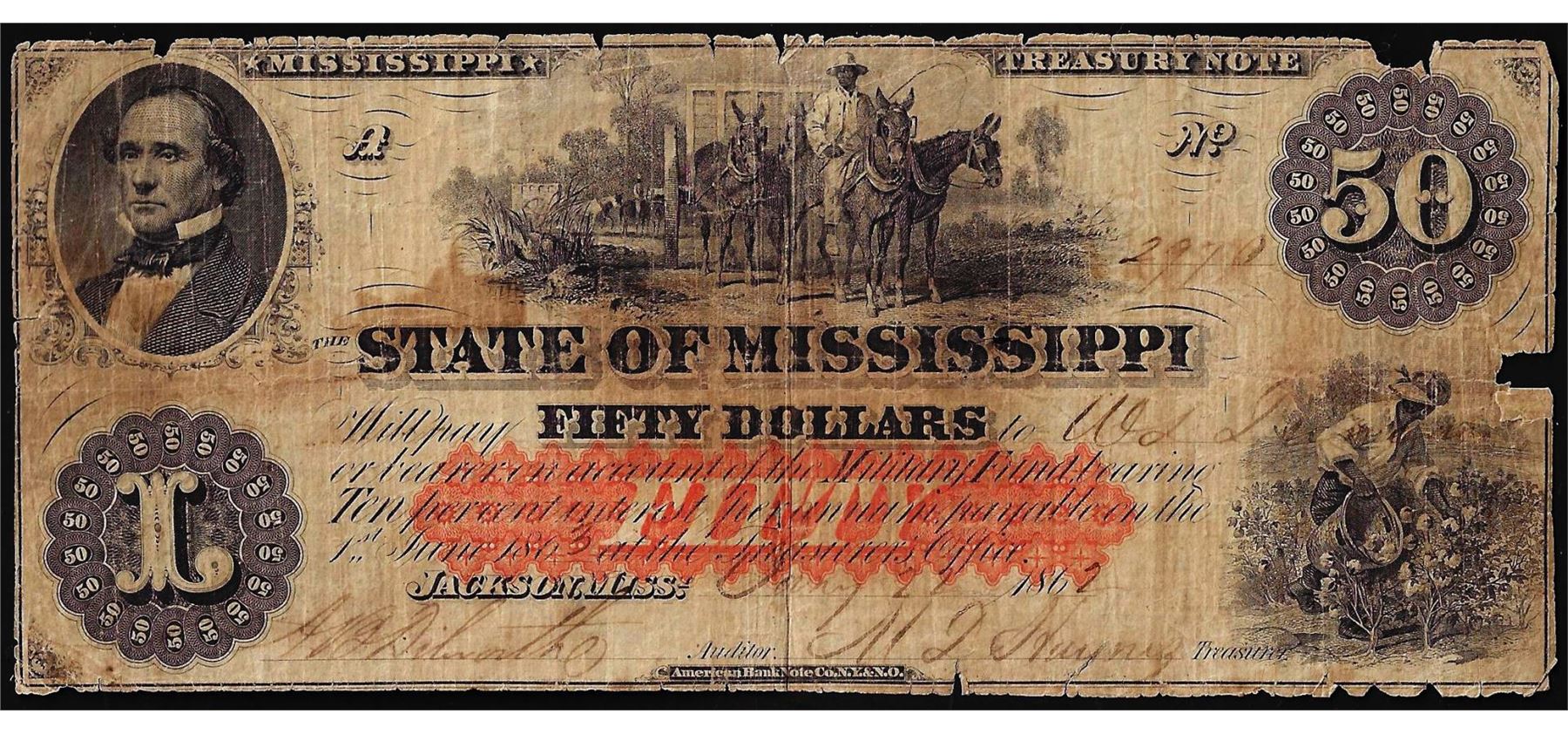 One 1862 $50 State of Mississippi Jackson, MS Obsolete Bank Note.