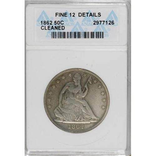 <B>1862 50C --Cleaned--ANACS. Fine 12 Details.</B></I> NGC Census: (0/61). PCGS Population (0/82). Mintage: 253,000. Numismedia Wsl. Price for NGC/PCGS coin in F12: $64. (#6307)<BR><BR><b>Shipping:</b> Coins & Currency (<a target="_blank" href="http://www.heritageauctions.com/common/shipping.php">view shipping information</a>)