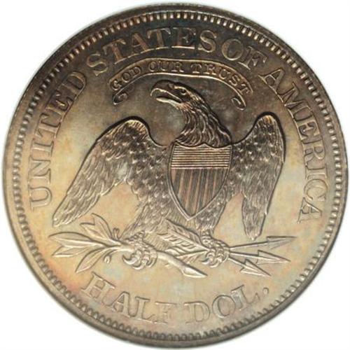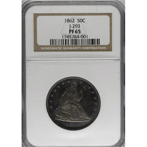 <B>1862 50C Half Dollar, Judd-293, Pollock-351, R.5, PR65 NGC.</B></I> Regular obverse die, combined with a regular No Motto reverse die but with the motto GOD OUR TRUST added on a scroll above the eagle's head. Struck in silver with a reeded edge. About two dozen sets of this design were struck, according to W. Elliot Woodward's May 1863 sale. The fields are deeply reflective with scattered rose and lilac toning over each side. Fully struck and problem-free.<BR><BR><b>Shipping:</b> Coins & Currency (<a target="_blank" href="http://www.heritageauctions.com/common/shipping.php">view shipping information</a>)