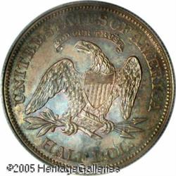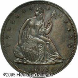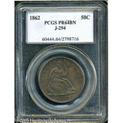 <B>1862 50C Half Dollar, Judd-294, Pollock-352, Low R.7, PR64 Brown PCGS.</B></I> The design is similar to that used on regular issue 1862 Seated half dollars, but a scroll with the motto IN GOD WE TRUST has been added in the reverse field above the eagle's head. Struck in copper with a reeded edge. Fully struck with deep brown patina that is accented by blue around the legends.<BR><I>From The Mike Jacobson Collection.</B></I> Lot:9831