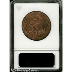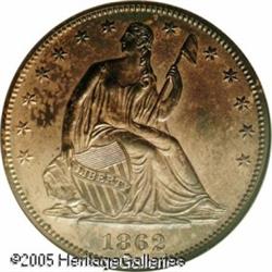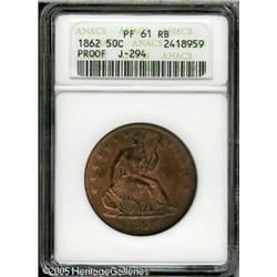 <B>1862 50C Half Dollar, Judd-294, Pollock-352, Low R.7, PR61 Red and Brown ANACS.</B></I> The design is similar to that used on regular issue 1862 Seated Half Dollars, but a scroll with the motto IN GOD WE TRUST has been added in the reverse field above the eagle's head. Struck in copper with a reeded edge. The otherwise pink-copper surfaces reveal swirls of blue-brown patina over the central and right obverse and the right side of the reverse. Sharply struck with no mentionable surface distractions. Lot:9832