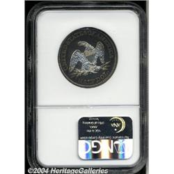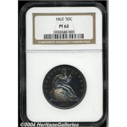 <B>1862<50C> PR62 NGC.</B></I> Aquamarine, rose-violet, and pastel gold colors invigorate this well struck and deeply mirrored example. A couple of faint roller marks across Liberty's chest are strictly of mint origin. A mere 550 proofs were issued. <BR><BR><B>Important notice:</B> Heritage usually auctions material at the rate of 200-250 lots per hour. On some occasions eBay Live bid software or the Internet may not be able to keep up with the pace of the auction. We recommend placing a realistic absentee bid now as insurance to avoid disappointment. Occasionally the auctioneer may eliminate or reject an eBay Live bid, and the auctioneer may also reopen a lot after the close of the eBay live bidding (usually because we missed an audience bid), and may reject your bid even if it shows you as the winning bidder. By bidding via eBay Live, you agree that Heritage may award the lot to another bidder at its sole discretion under the circumstances described above or any other reasonable circumstances. Since eBay bids are not shown to us until we open the lot on the floor, we treat those bids just like floor bids. In most cases the floor responds before the eBay bid is presented to us, due to Internet lag time, so for consistency we have made it a policy that floor bids are always considered first over tie eBay live bids. Also please note that all Heritage lots purchased through eBay Live carry a 20% Buyer's Premium. Please make sure you read the Terms and Conditions before you bid.