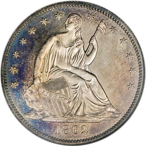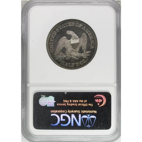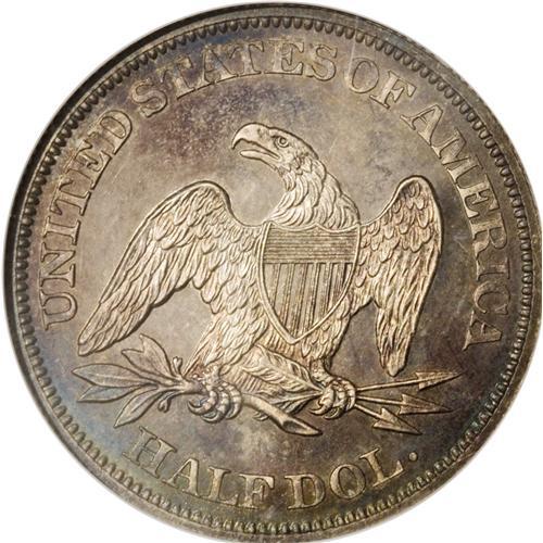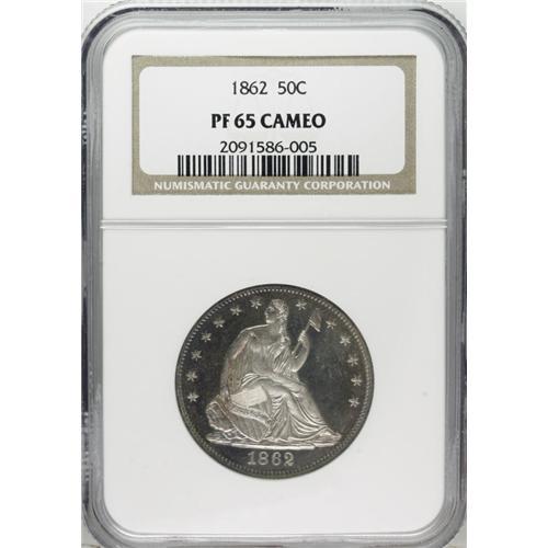 <B>1862 50C PR65 Cameo NGC.</B></I> The numerals 1862 are delicately impressed into the die, like most proof coins seen of this date, but the subsequent strike is notably bold. The centers are silver and nearly untoned, radiating outward to pinkish-gray, magenta, and iridescent blue. Superb luster emerges, unimpeded by the moderate toning. The grade appears conservative, as even under a loupe no mentionable distractions are apparent. Census: 3 in 65 Cameo, 3 finer (12/06).<BR><BR><b>Shipping:</b> Coin/Currency (<a target="_blank" href="http://www.heritageauctions.com/common/shipping.php">view shipping information</a>)