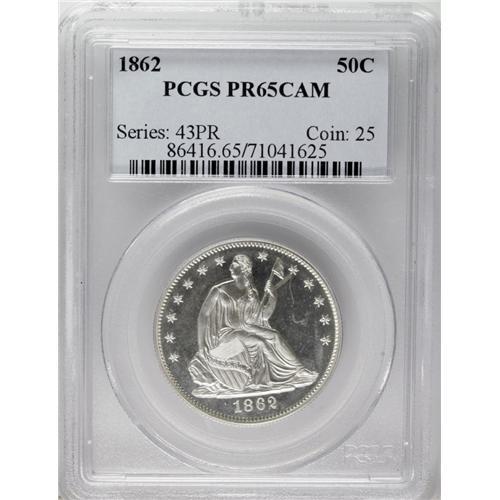 <B>1862 50C PR65 Cameo PCGS.</B></I> Small streaks and patches of cloudy toning cover parts of the obverse, while the reverse is largely free of haze. What little patina there is does not dim the strong reflectivity and contrasting devices. Of the 550 specimens coined for this issue, the present example is something special indeed. Population: 1 in 65 Cameo, 0 finer (10/06).<BR><I>From The Dr. Robert J. Loewinger Collection.</B></I><BR><BR><b>Shipping:</b> Coin/Currency (<a target="_blank" href="http://www.heritageauctions.com/common/shipping.php">view shipping information</a>) <BR><BR><B>Important noti