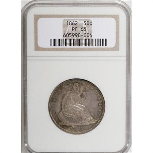 <B>1862 50C PR65 NGC.</B></I> This is a gorgeous Gem proof with splendid pewter-gray and iridescent toning that creates strong eye appeal. Every detail is boldly defined. A degree of contrast can be detected, but the original toning has a subduing influence that prevents any additional designation. Census: 22 in 65, 9 finer (10/07).<BR><I>From The Fleur Wales-Baillie Collection.</B></I><BR><BR><B>Coin Engraver:</B> Christian Gobrecht<BR><BR><b>Shipping:</b> Coins & Currency (<a target="_blank" href="http://www.heritageauctions.com/common/shipping.php">view shipping information</a>)