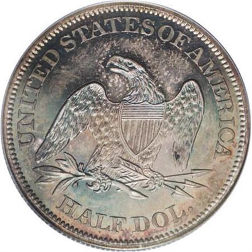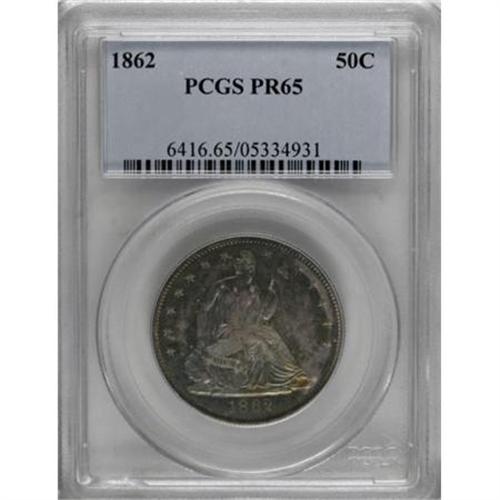 <B>1862 50C PR65 PCGS.</B></I> Type Two Reverse. Attractive orange and aquamarine embraces this razor-sharp specimen. Among the finest survivors of this Civil War issue. A mere 550 proofs were struck, some of which may have been melted by the Mint as unsold. Population: 15 in 65, 3 finer (8/07). <BR><BR><B>Coin Engraver:</B> Christian Gobrecht<BR><BR><b>Shipping:</b> Coins & Currency (<a target="_blank" href="http://www.heritageauctions.com/common/shipping.php">view shipping information</a>)