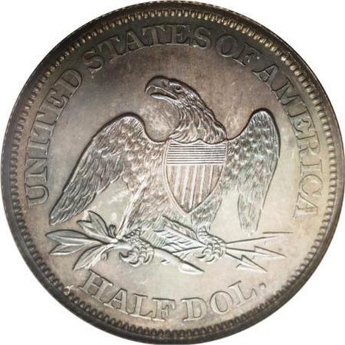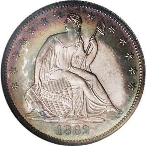 <B>1862 50C PR66 NGC.</B></I> A gorgeous proof with glittering, deeply mirrored fields on both sides, accented by lighter iridescent toning. The obverse has a small circle of ivory-gray, surrounded by lilac, amber, and blue-green toning. The reverse is similarly toned, but lacks the lighter color found on the obverse.<BR> Proof No Motto half dollars are much scarcer than those of the modified With Motto design. Factor in the nature of Civil War issues, with the rarity of business strikes, and this issue qualifies as an important and highly desirable numismatic prize. Census: 6 in 66, 2 finer (8/07).<BR><BR><B>Coin Engraver:</B> Christian Gobrecht<BR><BR><b>Shipping:</b> Coins & Currency (<a target="_blank" href="http://www.heritageauctions.com/common/shipping.php">view shipping information</a>)
