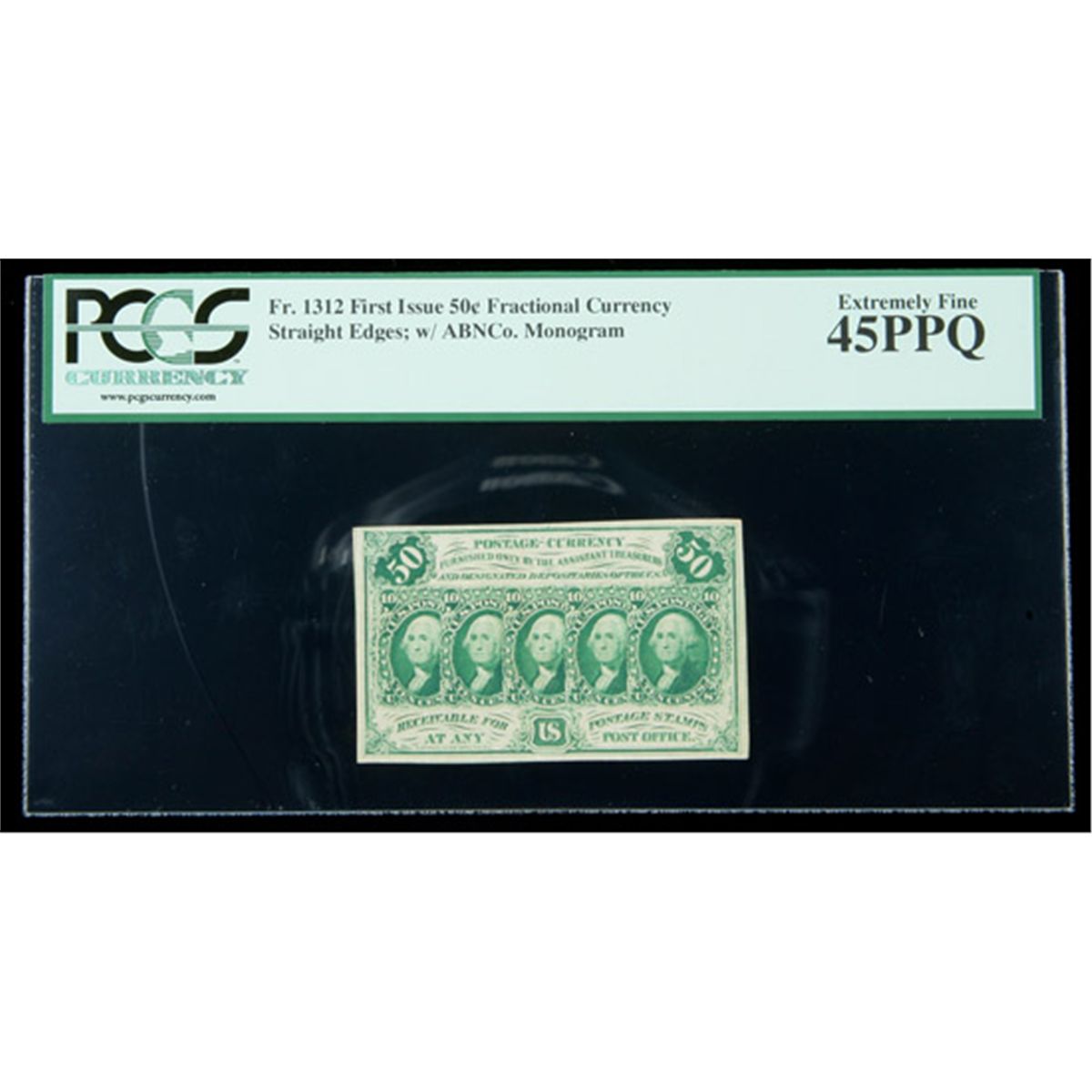 1862, 50¢ Fractional Currency. First Issue, straight edges, with ABCO monogram. Extremely Fine 45PPQ. . Fr-1312. A few light folds are present on this well margined and attractive example.