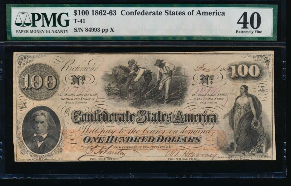 One 1862-63 $100 Confederate States of America Note PMG 40.