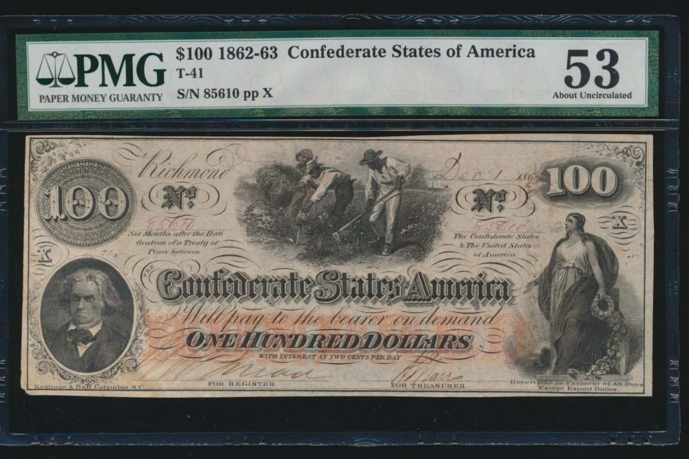 One 1862-63 $100 Confederate States of America Note PMG 53.
