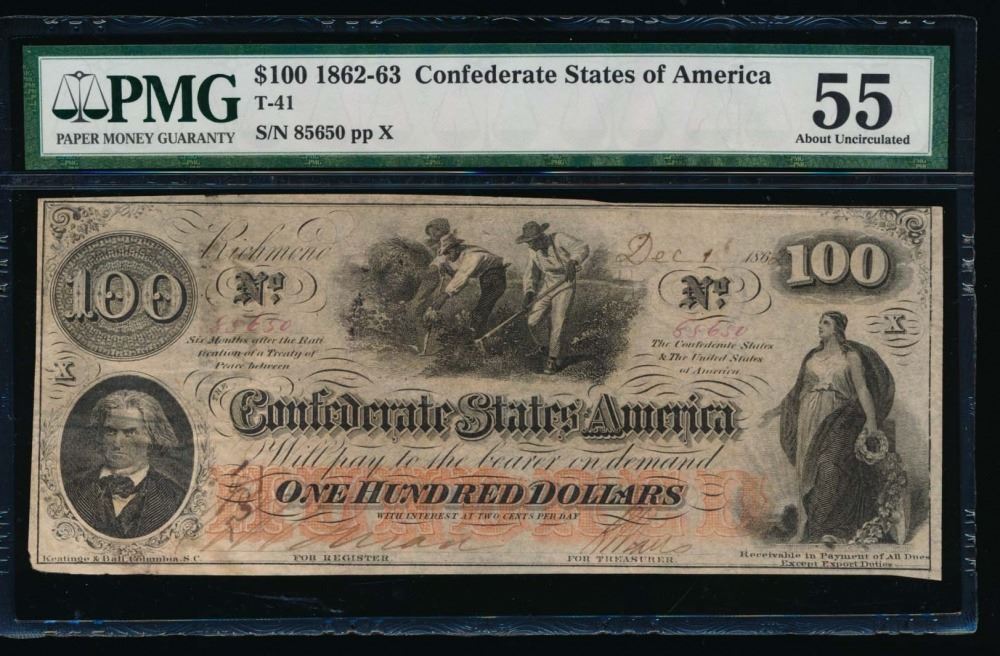 One 1862-63 $100 Confederate States of America Note PMG 55.