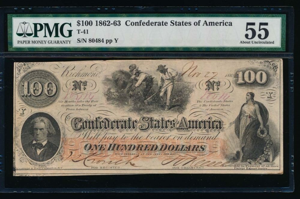 One 1862-63 $100 Confederate States of America Note PMG 55.