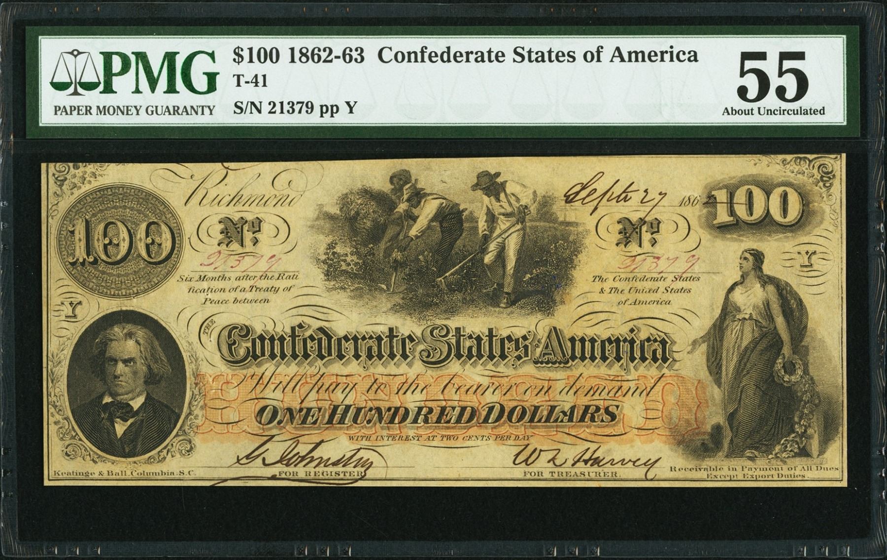 One 1862-63 $100 Confederate States of America Note PMG 55.