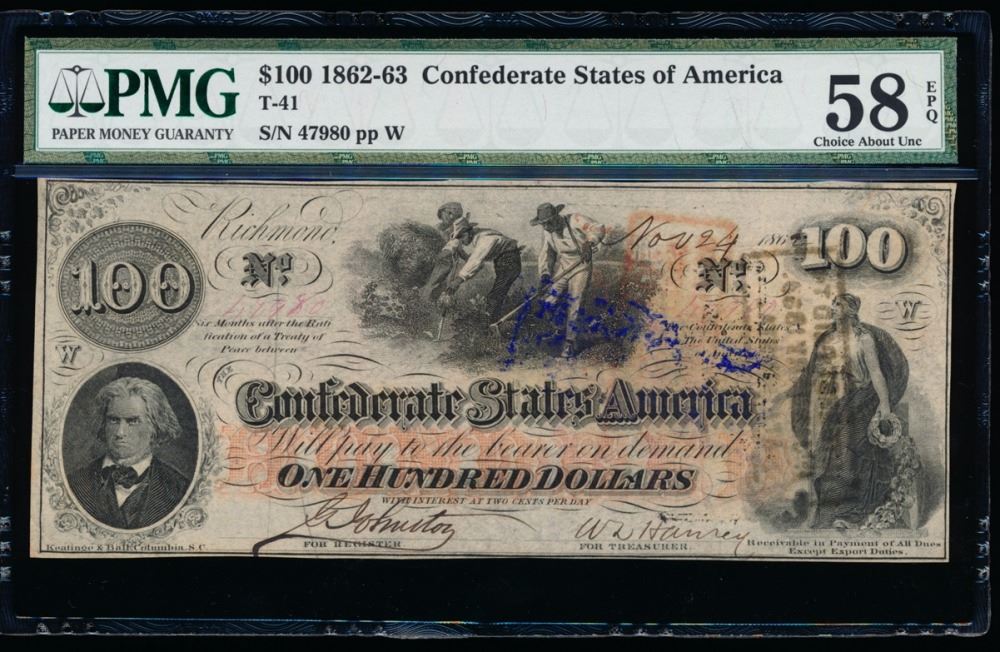 One 1862-63 $100 Confederate States of America Note PMG 58EPQ.
