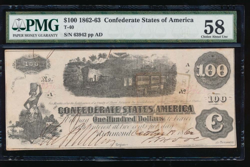 One 1862-63 $100 Confederate States of America Note PMG 58.