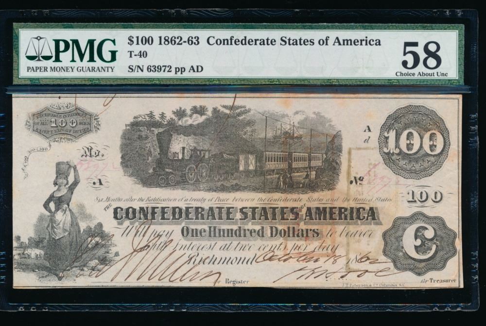 One 1862-63 $100 Confederate States of America Note PMG 58.