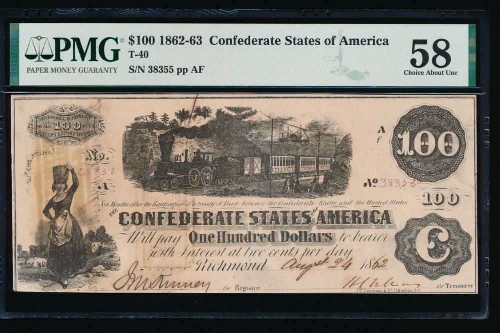 One 1862-63 $100 Confederate States of America Note PMG 58.