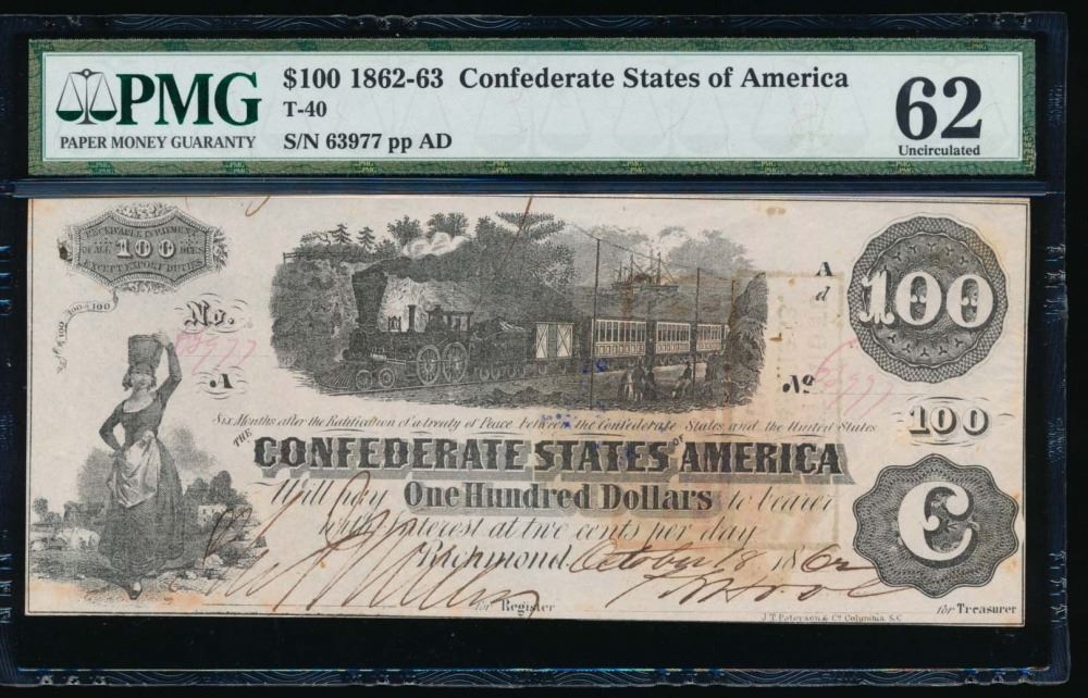 One 1862-63 $100 Confederate States of America Note PMG 62.