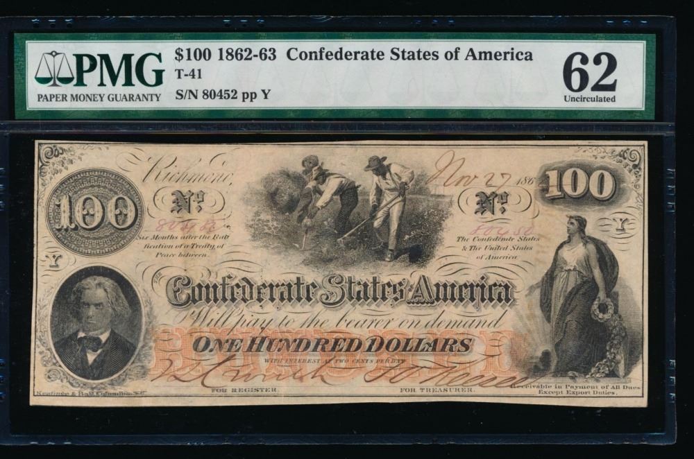 One 1862-63 $100 Confederate States of America Note PMG 62.