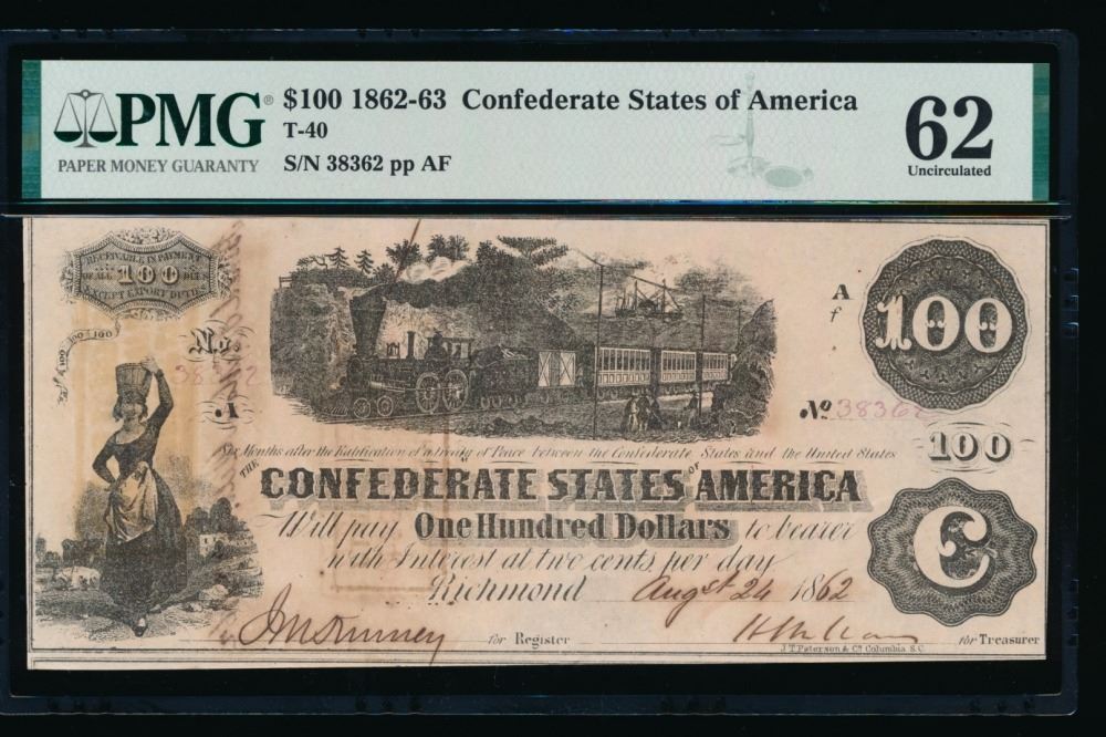 One 1862-63 $100 Confederate States of America Note PMG 62.