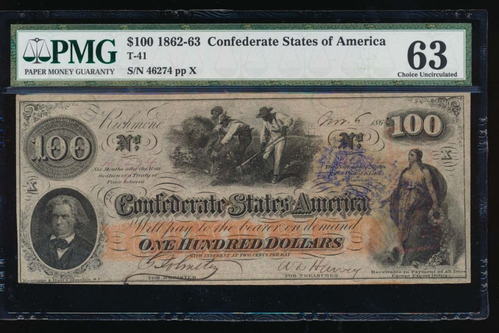 One 1862-63 $100 Confederate States of America Note PMG 63.