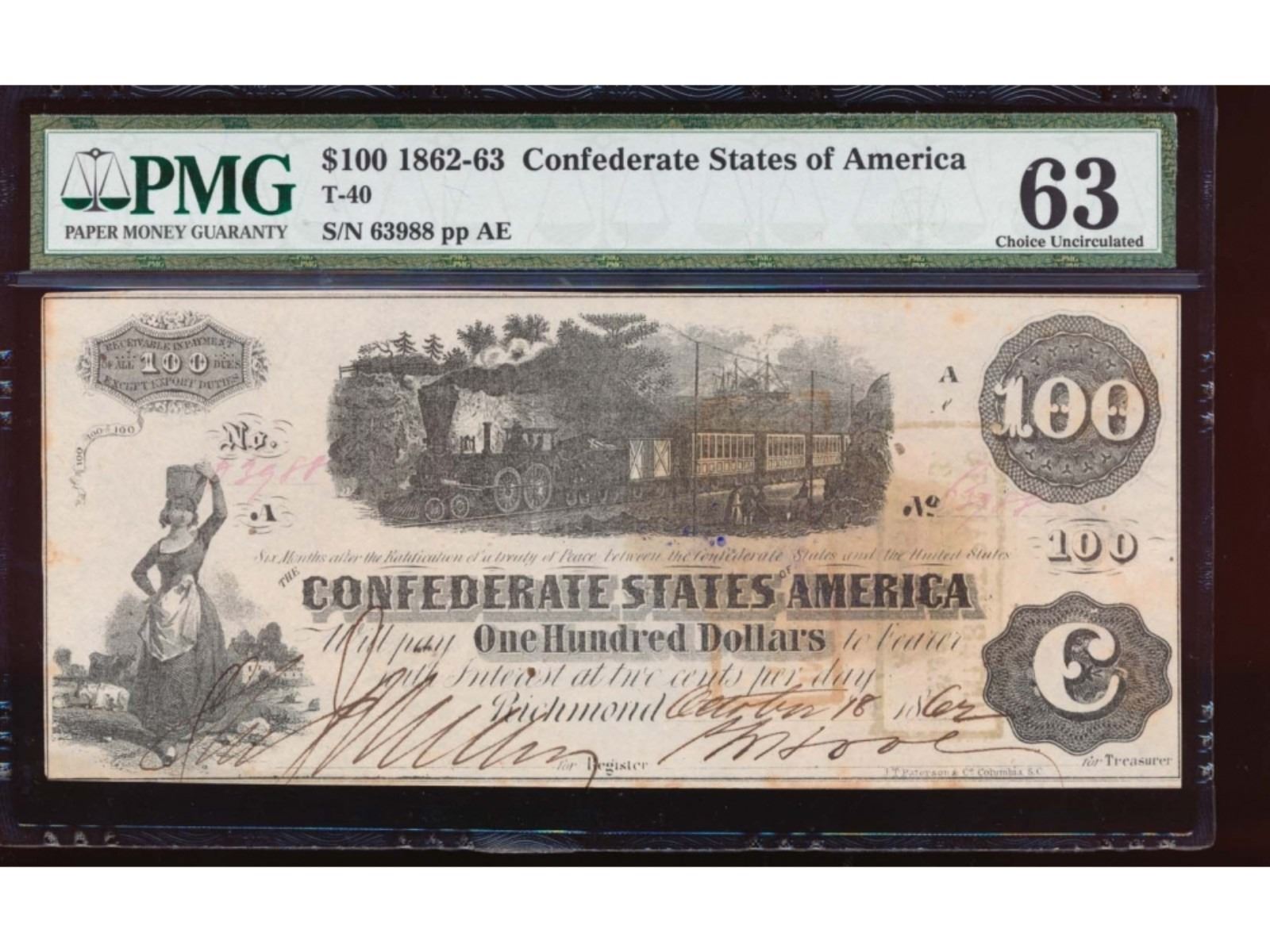 One 1862-63 $100 Confederate States of America Note PMG 63.