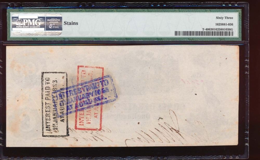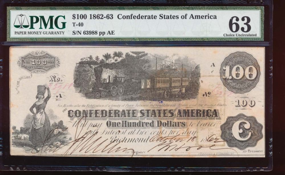 One 1862-63 $100 Confederate States of America Note PMG 63.