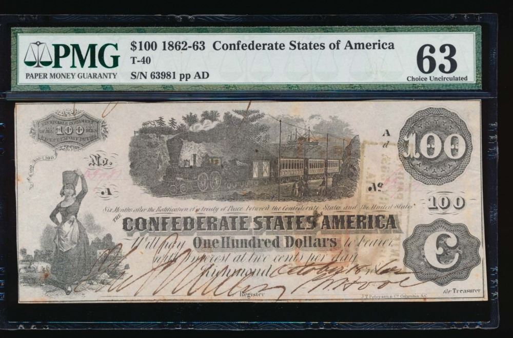 One 1862-63 $100 Confederate States of America Note PMG 63.