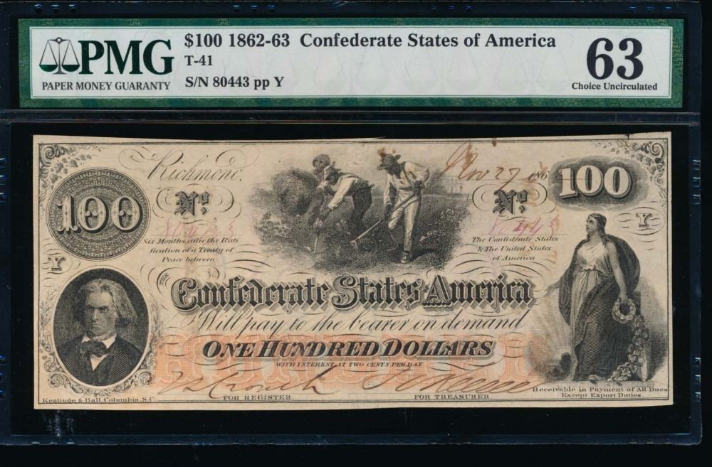 One 1862-63 $100 Confederate States of America Note PMG 63.