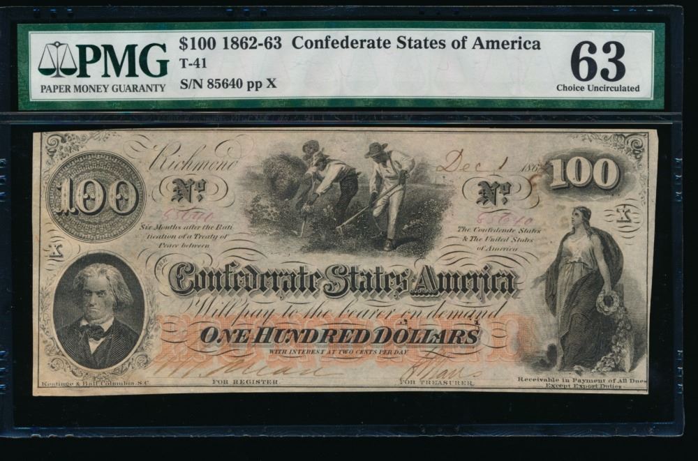 One 1862-63 $100 Confederate States of America Note PMG 63.
