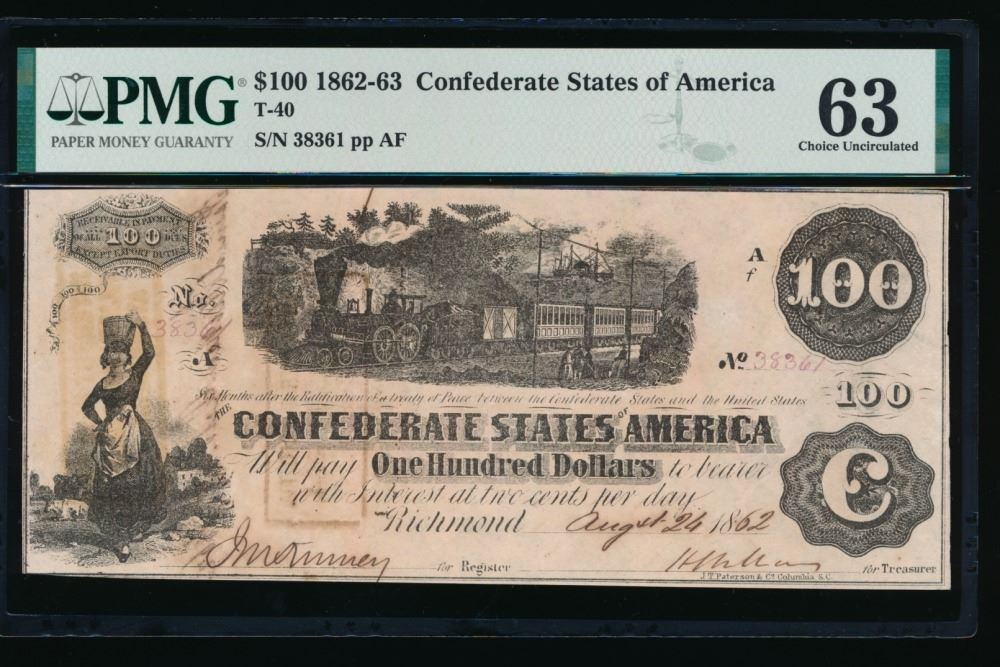 One 1862-63 $100 Confederate States of America Note PMG 63.